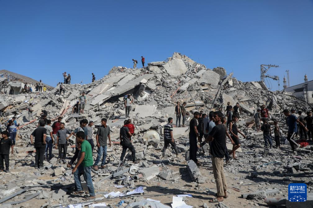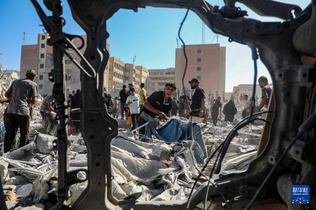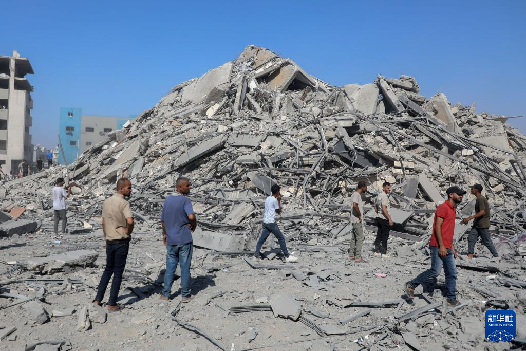 9月8日,人们在加沙城查看一座高层建筑遭以色列军队空袭后的废墟。新华社发(里泽克·阿卜杜勒贾瓦德摄)