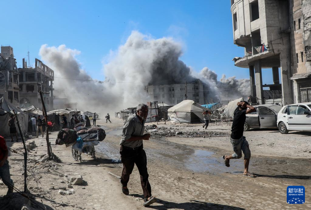9月8日,加沙城一座高层建筑遭以色列军队空袭后升起浓烟,民众纷纷躲避。新华社发(里泽克·阿卜杜勒贾瓦德摄)