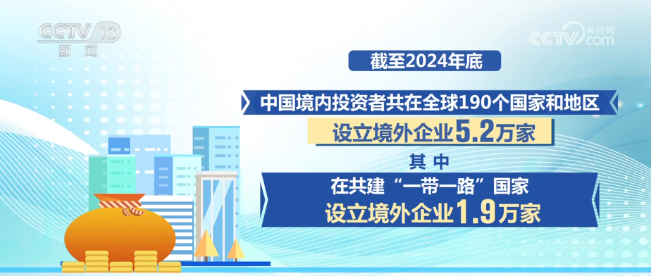 境外企业覆盖全球超过80%的国家和地区。截至2024年底,中国境内投资者共在全球190个国家和地区设立境外企业5.2万家。其中,在共建“一带一路”国家设立境外企业1.9万家。