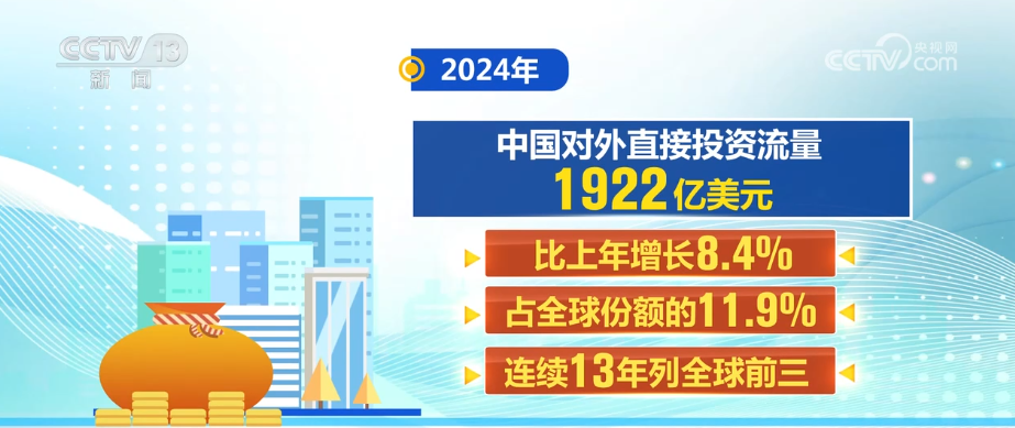 2024年,中国对外直接投资流量1922亿美元,比上年增长8.4%,占全球份额的11.9%,连续13年列全球前三。