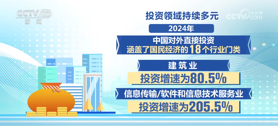 投资领域持续多元。2024年,中国对外直接投资涵盖了国民经济的18个行业门类。对建筑业、信息传输/软件和信息技术服务业投资增长较快,增速分别为80.5%、205.5%