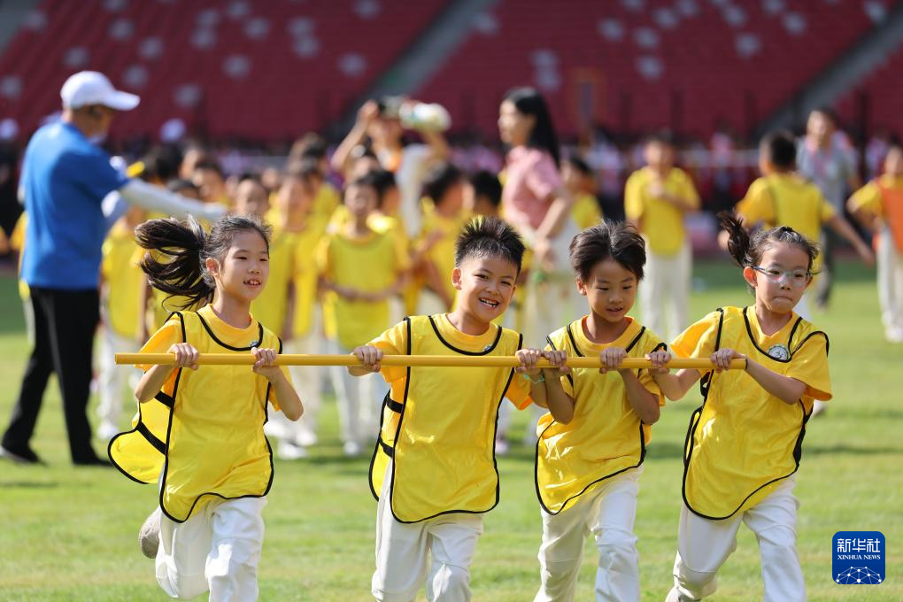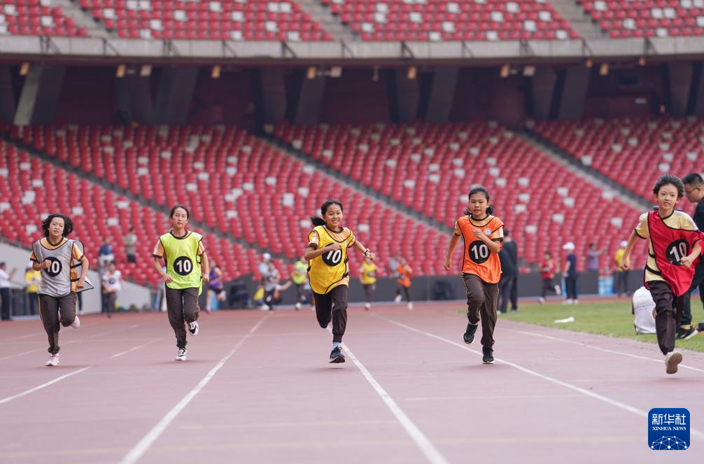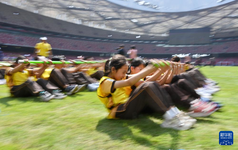 9月9日,在国家体育场,学生们参加“旋风跑”项目。新华社记者 郑悦 摄