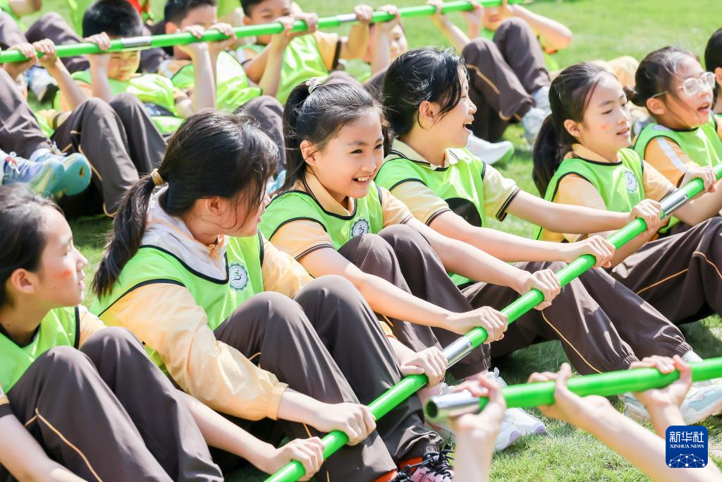 9月9日,在国家体育场,学生们参与“推大球比赛”。新华社记者 任超 摄