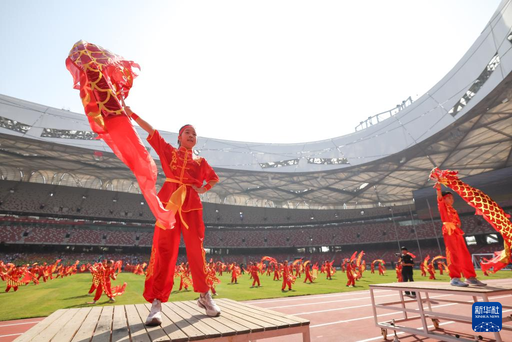 9月9日,在国家体育场,学生们表演龙操。新华社记者 林煜 摄