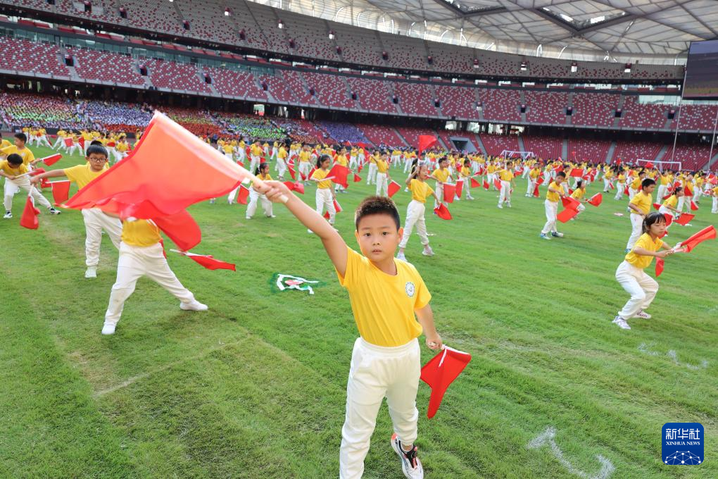 9月9日,在国家体育场,学生们参加旗操展演。新华社记者 郑悦 摄