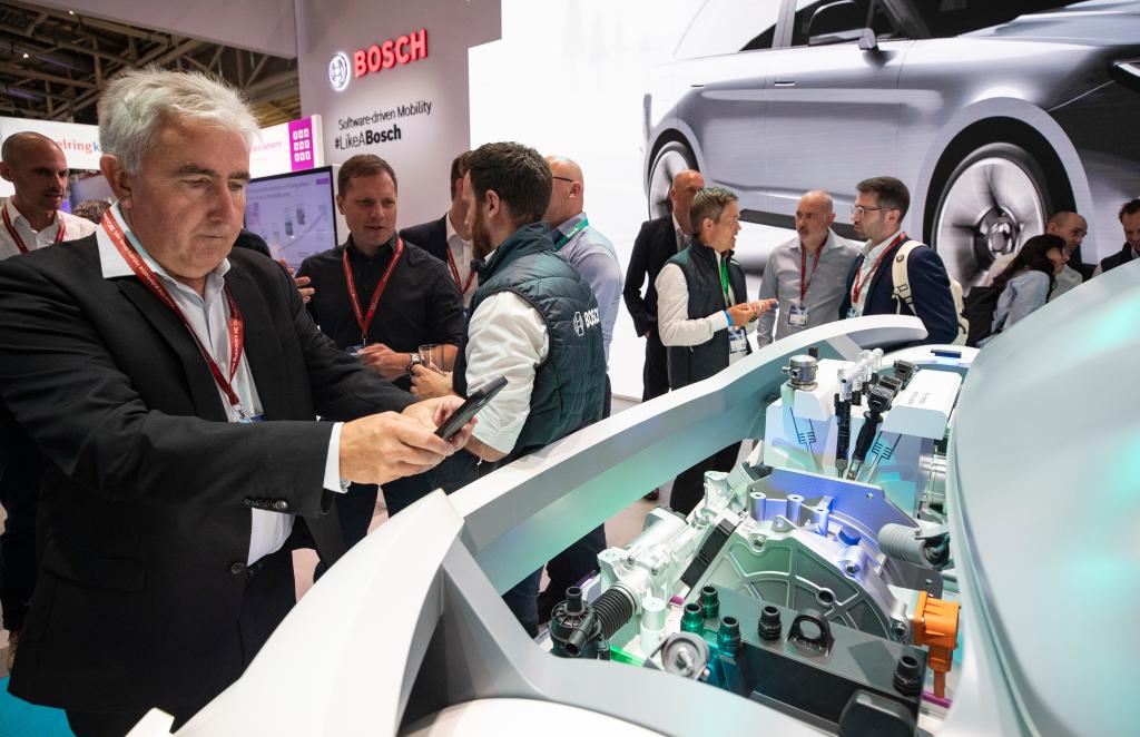 9月9日,一名男子在德国慕尼黑国际车展的博世展台参观拍照。