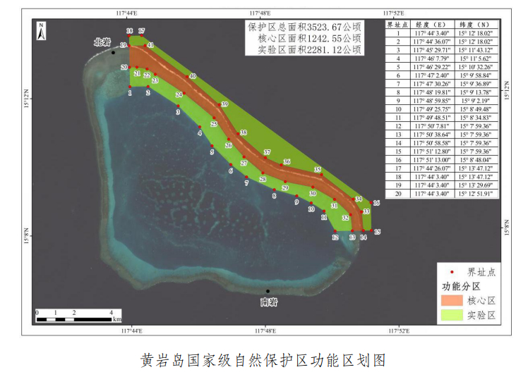 黄岩岛国家级自然保护区位于海南省三沙市,面积3523.67公顷,其中核心区面积1242.55公顷,实验区面积2281.12公顷,主要保护对象为珊瑚礁生态系统。