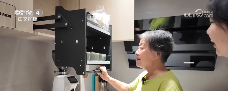 除了卫生间,厨房也藏着不少“适老巧思”。操作台整体降低了,橱柜里还配有自动升降架,轻轻一推,碗盘调料触手可及。