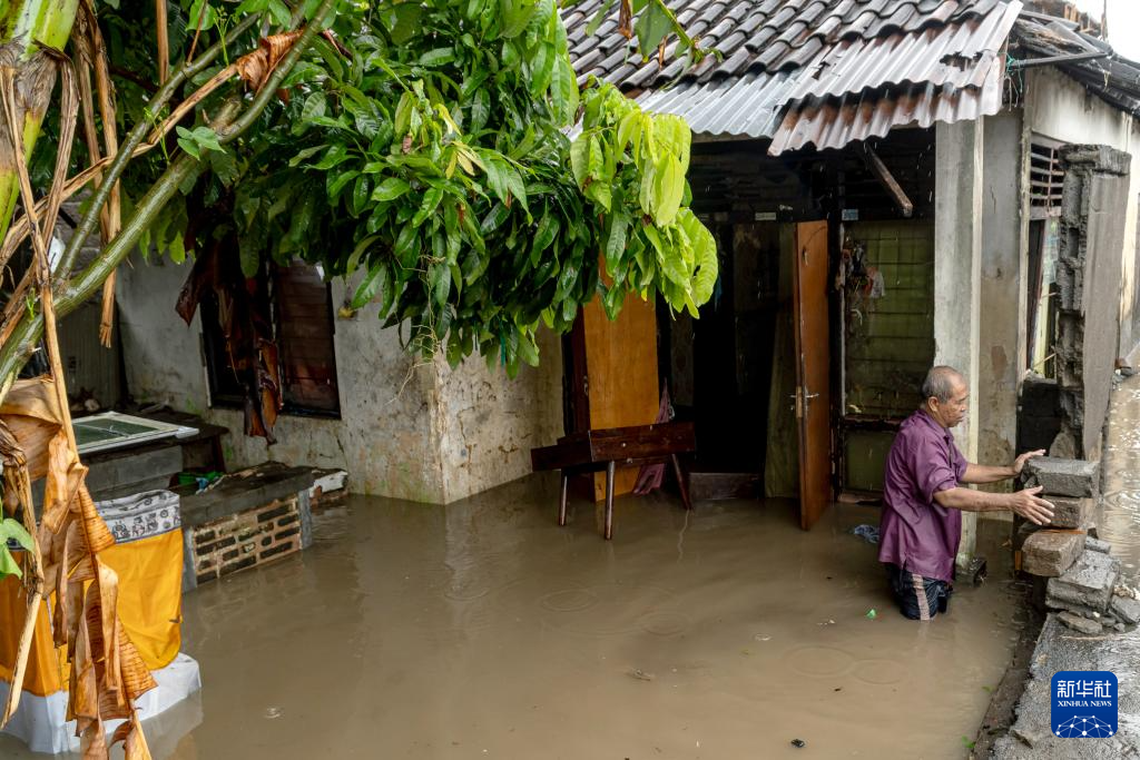 9月10日,在印度尼西亚巴厘岛登巴萨,一名男子站在遭到洪水侵袭的房屋外。