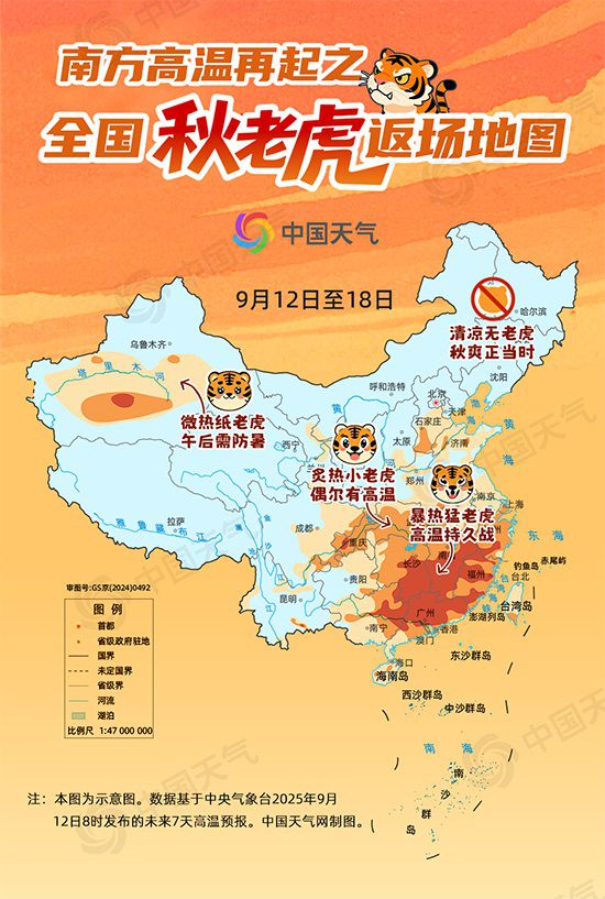 中国天气网讯 眼下虽已进入9月中旬,但秋意尚未大范围铺展,多地热度不容小觑。今起一周(9月12日至18日),随着南方高温天气再度增多,秋老虎将重返天气“舞台”,局地或热到破纪录。哪里秋老虎最猛?为何此时秋老虎还来势汹汹?中国天气网推出秋老虎返场地图,看你会遇到什么“虎”。