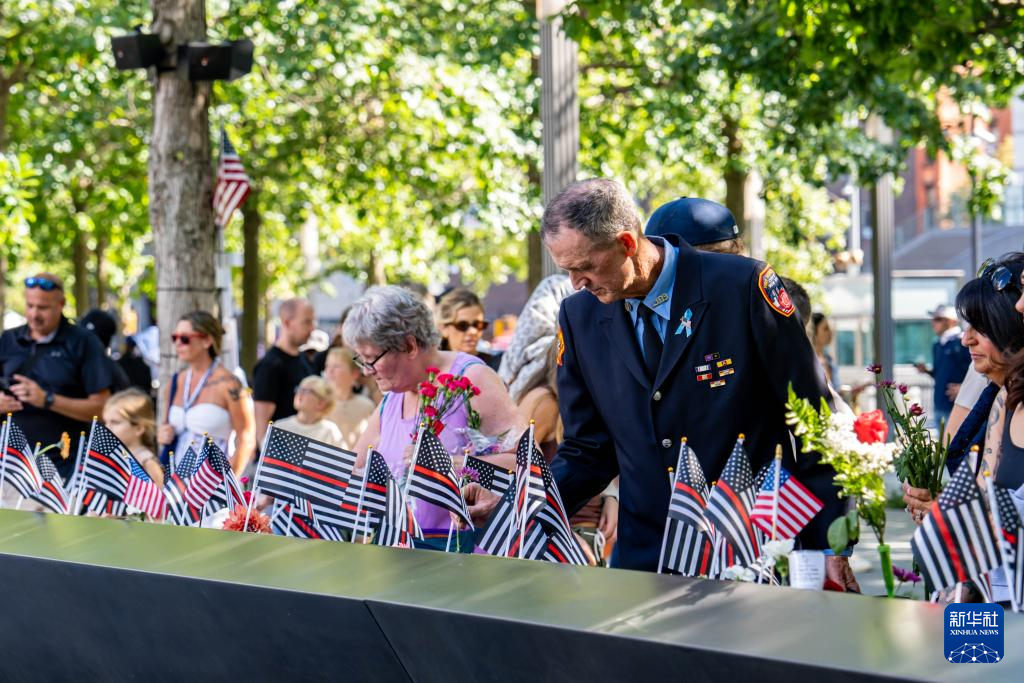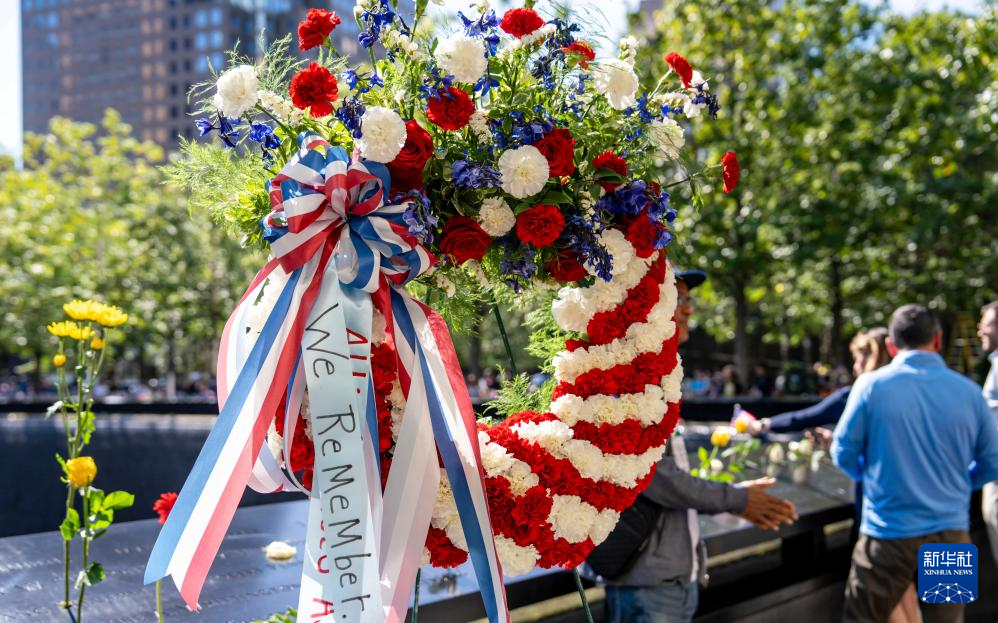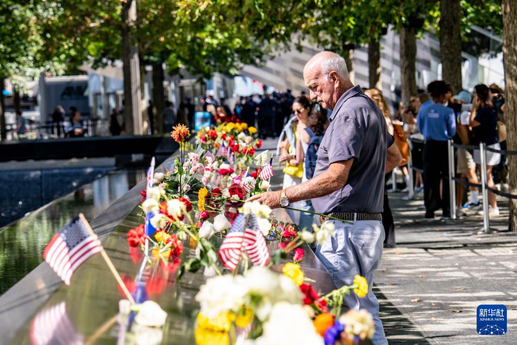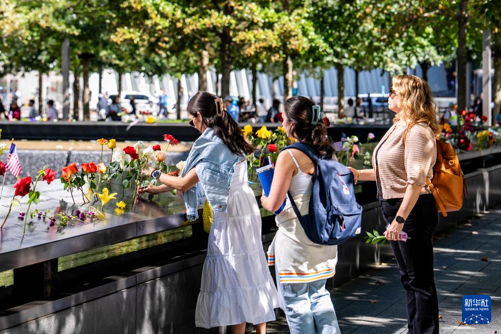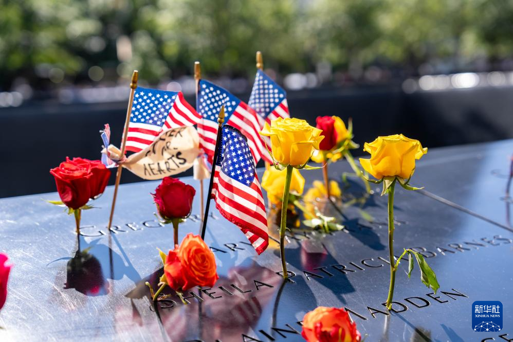 这是9月11日在美国纽约“9·11”纪念广场拍摄的悼念“9·11”恐怖袭击事件遇难者的国旗和花。