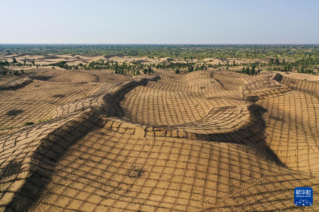 秋日,在内蒙古鄂尔多斯市杭锦旗境内的库布其沙漠,治沙工人忙碌地铺设沙障,进行库布其沙漠治理。近年来,杭锦旗有序推进荒漠化防治工作,实施建设库布其沙漠锁边林草带、风沙路径阻隔带、光伏治沙带等治沙项目,促进库布其沙漠生态环境改善。