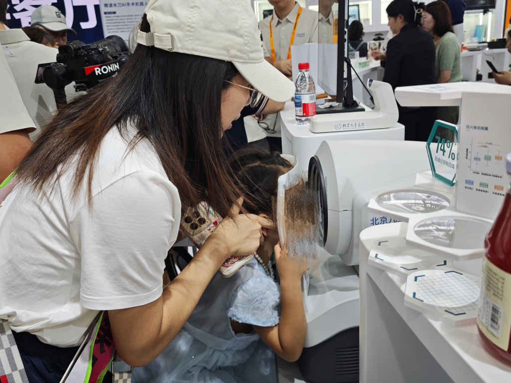 在2025年服贸会健康卫生服务专题展,一位工作人员带着小朋友体验智能屈光筛查仪。新华社记者 刘祯 摄