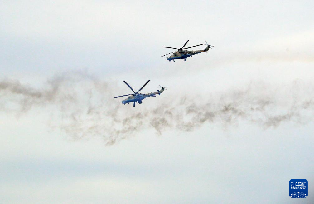 这是9月15日在白俄罗斯明斯克州拍摄的俄白“西部-2025”联合战略演习现场的直升机。
