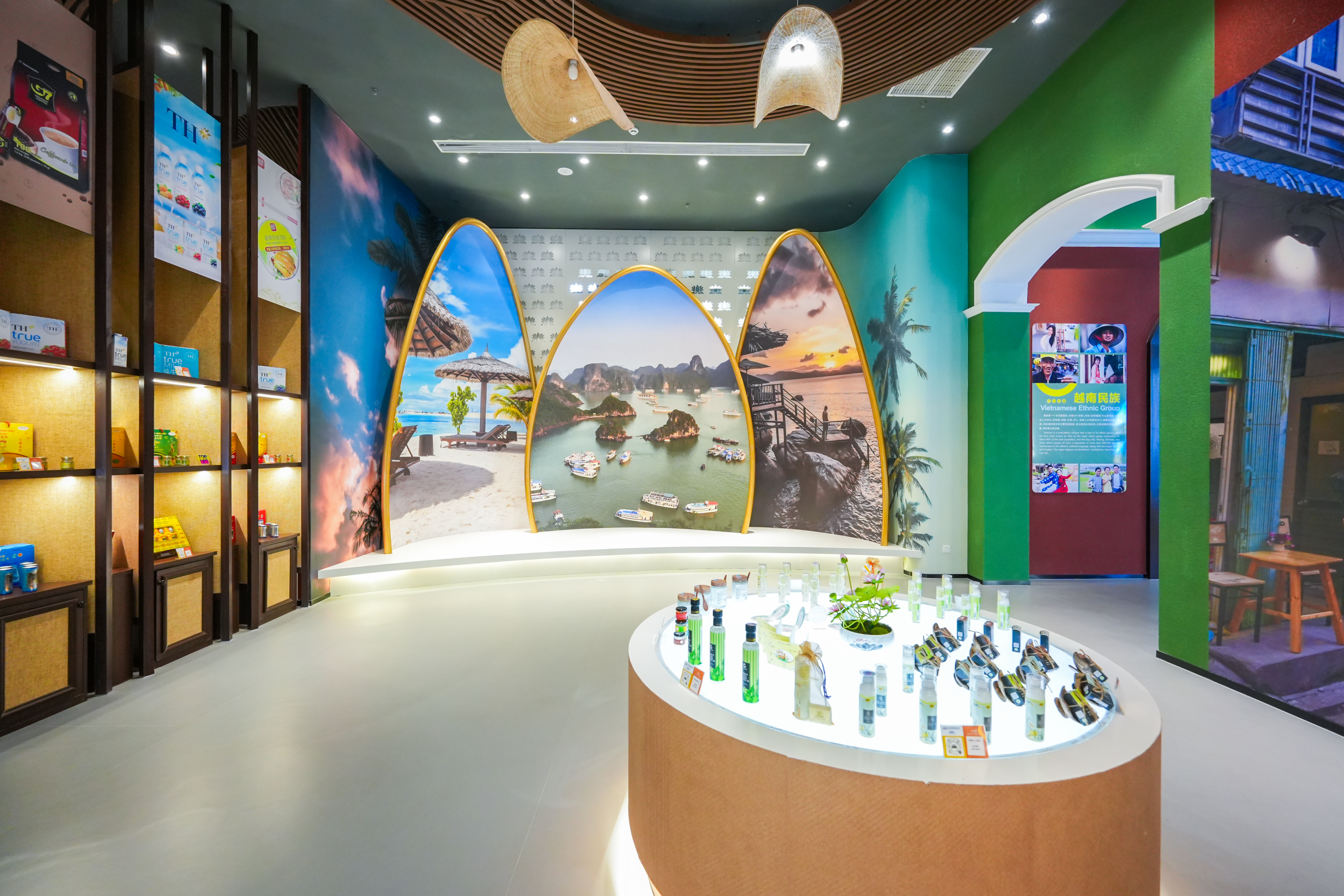 汇聚中心打造了17个主题展馆,包括文莱、柬埔寨、印度尼西亚等10个东盟国家主题馆,以及广西馆、世界清真商贸中心、巴基斯坦馆和日本、韩国、澳大利亚、新西兰4个RCEP国家主题馆。每个展馆深度融合各国建筑特色与文化元素,为访客提供沉浸式体验,展示各类特色商品,从新加坡的智能科技产品、泰国精致手工艺品,到越南咖啡和马来西亚榴莲食品,琳琅满目,应有尽有。
