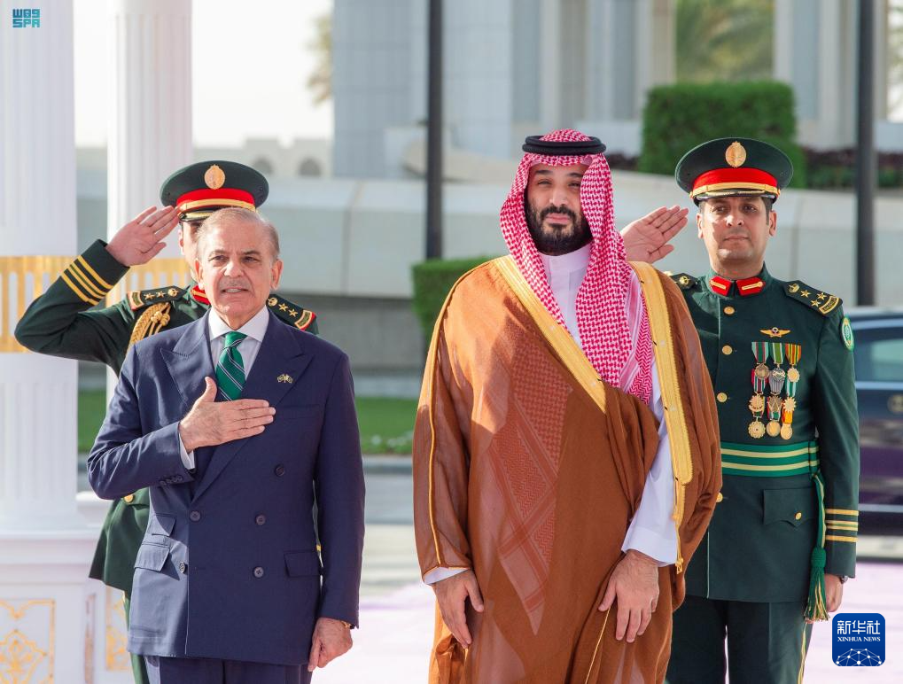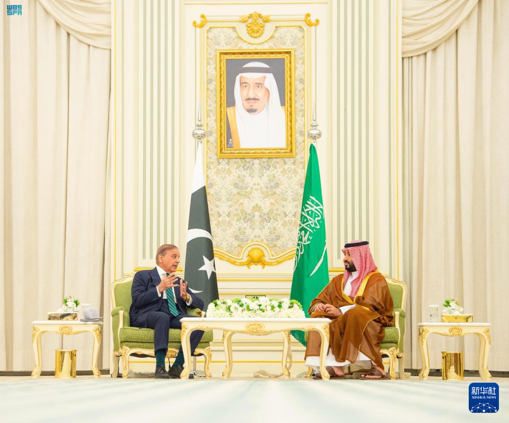 9月17日,沙特阿拉伯王储兼首相穆罕默德·本·萨勒曼(前右)在首都利雅得与到访的巴基斯坦总理夏巴兹·谢里夫举行会谈。