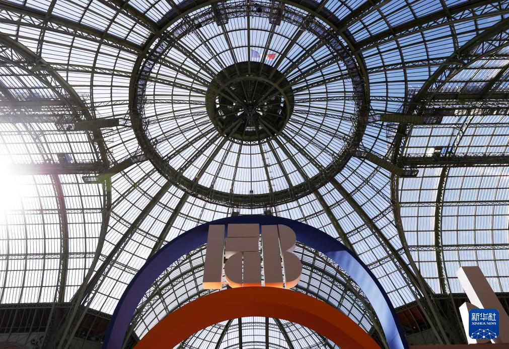 这是9月19日在法国巴黎大皇宫拍摄的巴黎FAB美术与古董艺博会(FAB Paris)的标识和大皇宫的标志性穹顶。