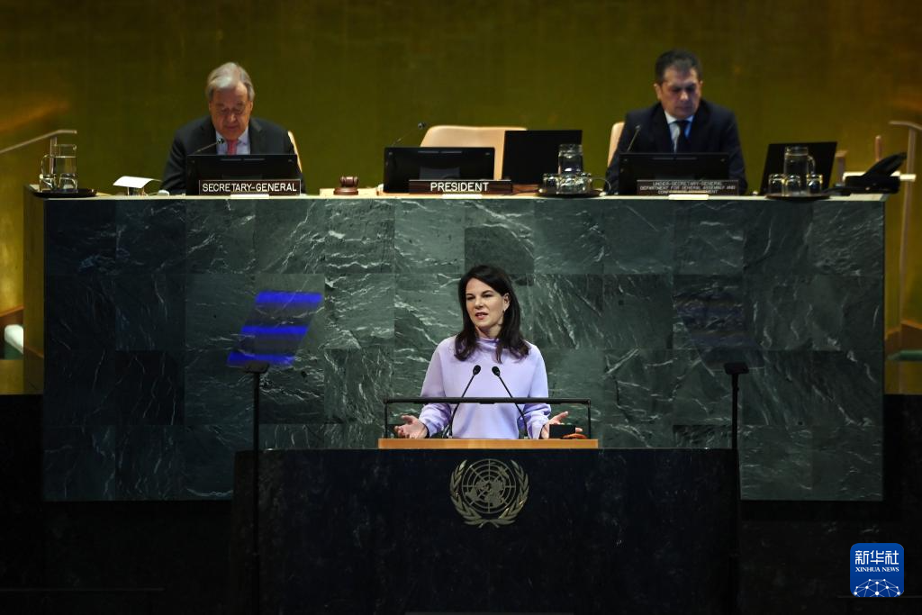 9月22日,在位于纽约的联合国总部,第80届联合国大会主席安娜莱娜·贝尔伯克(前)在纪念联合国成立80周年高级别会议上讲话。