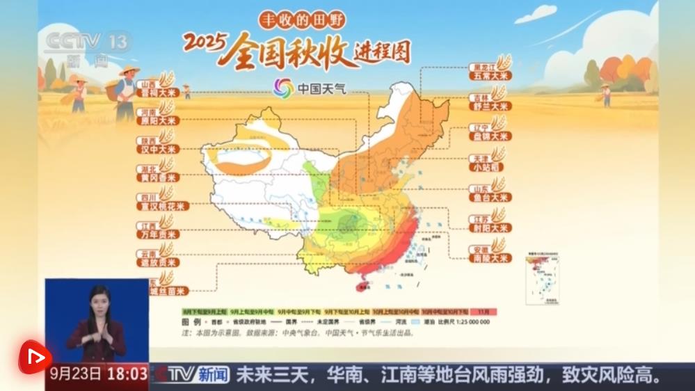 中国天气网发布了全国秋收进程图,一季稻和晚稻是秋收水稻的重头戏。其中,西南地区一季稻在9月成熟,东北地区一季稻在9月中下旬收获,长江中下游一季稻在9月中旬至10月上旬丰收,而最晚的区域是江南和华南地区,晚稻一般在10月下旬至11月中旬开始收割。