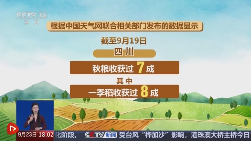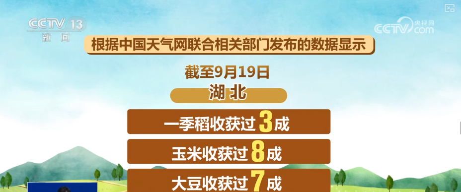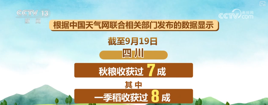 截至9月19日,四川秋粮收获过七成,其中,一季稻收获过八成。贵州秋粮收获过四成,湖北一季稻收获过三成,玉米收获过八成,大豆收获过七成。湖南一季稻收获过七成,新疆秋粮收获300余万亩。