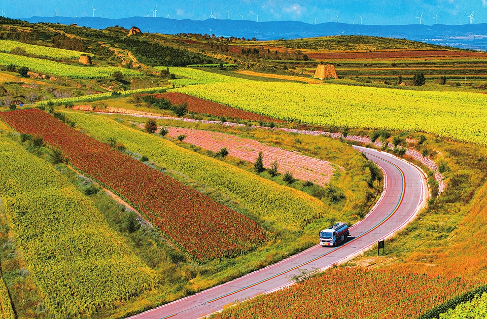 9月22日,车辆行驶在长城一号旅游公路大同段,道路两旁,色彩斑斓的农田与古老的长城交织在一起,勾勒出独具特色的塞外秋景。