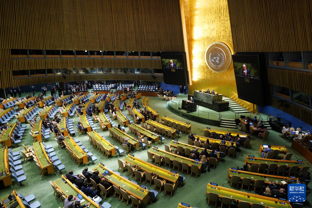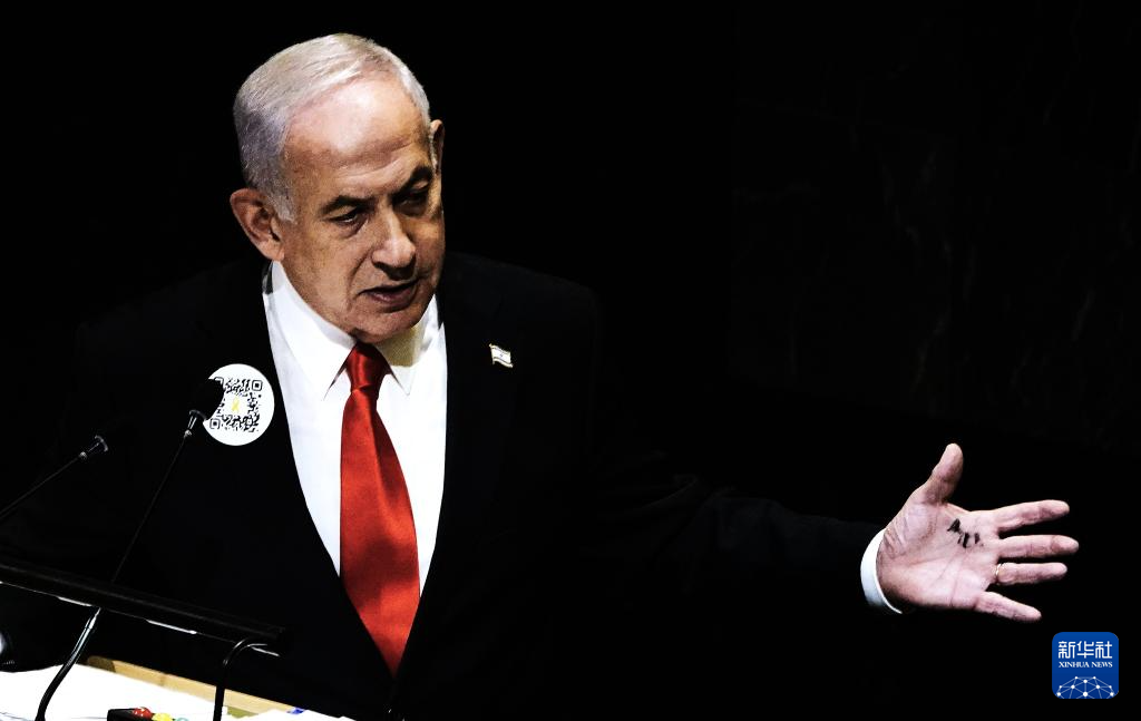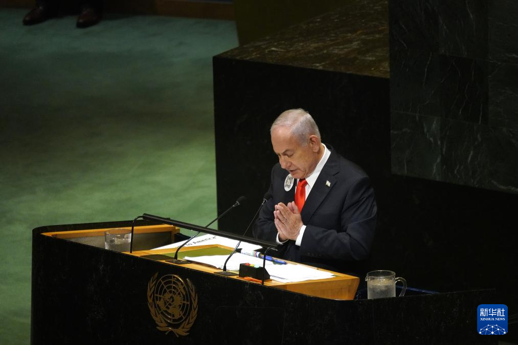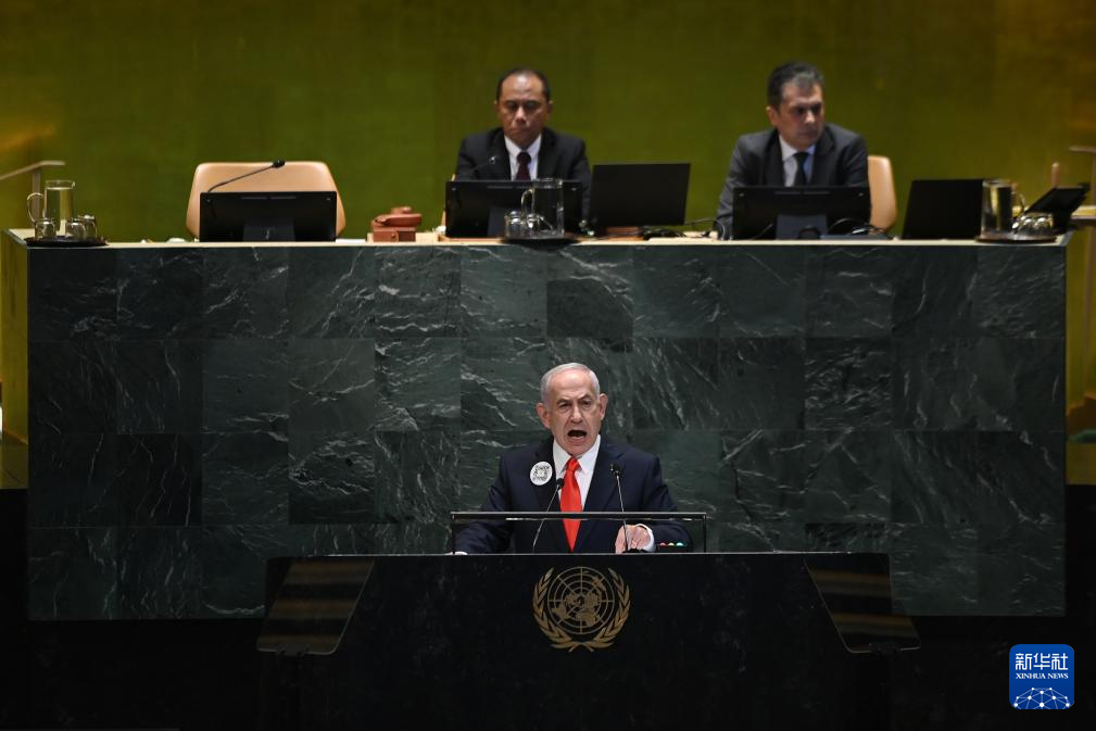 9月26日,在位于纽约的联合国总部,以色列总理内塔尼亚胡在第80届联合国大会一般性辩论发言。众多联合国会员国代表起身离席,退场抗议。新华社记者李睿摄
