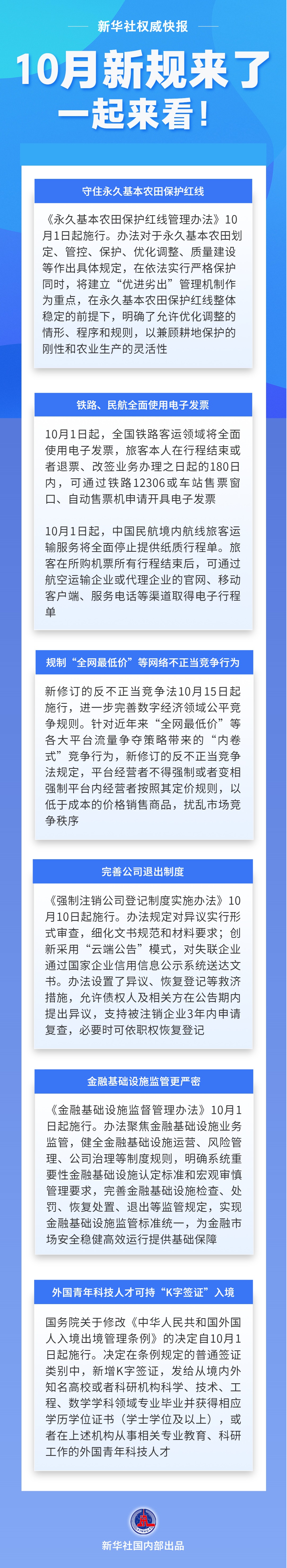 新办法守住永久基本农田保护红线;铁路、民航10月1日起全面使用电子发票;新修订的反不正当竞争法规制“全网最低价”等网络不正当竞争行为……10月新规来了,一起来看!