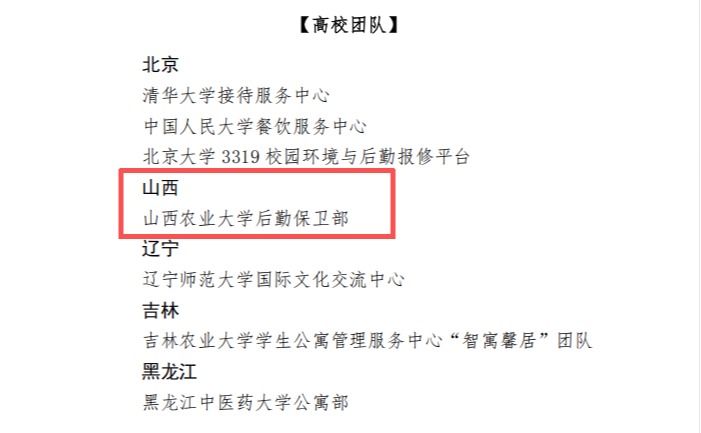 9月28日,中国教育后勤协会印发通知,公布全国教育后勤系统“2024年度最美后勤人”入选名单,山西农业大学后勤保卫部入选,是本次评选中我省高校唯一获得团队奖的后勤部门,全国有清华大学、中国人民大学、北京大学等高校的40个后勤团队获此殊荣。