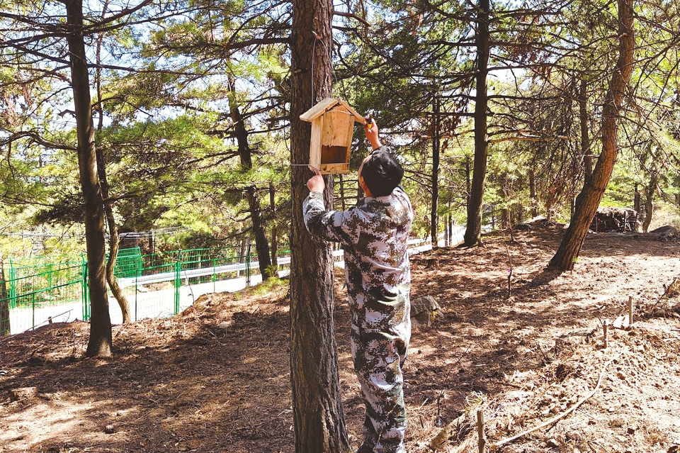 中条林局护林员安装鸟巢。