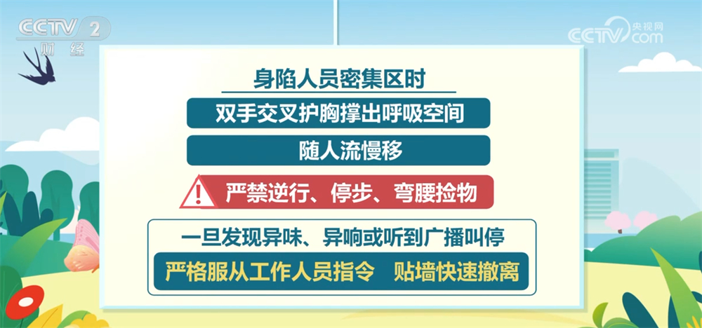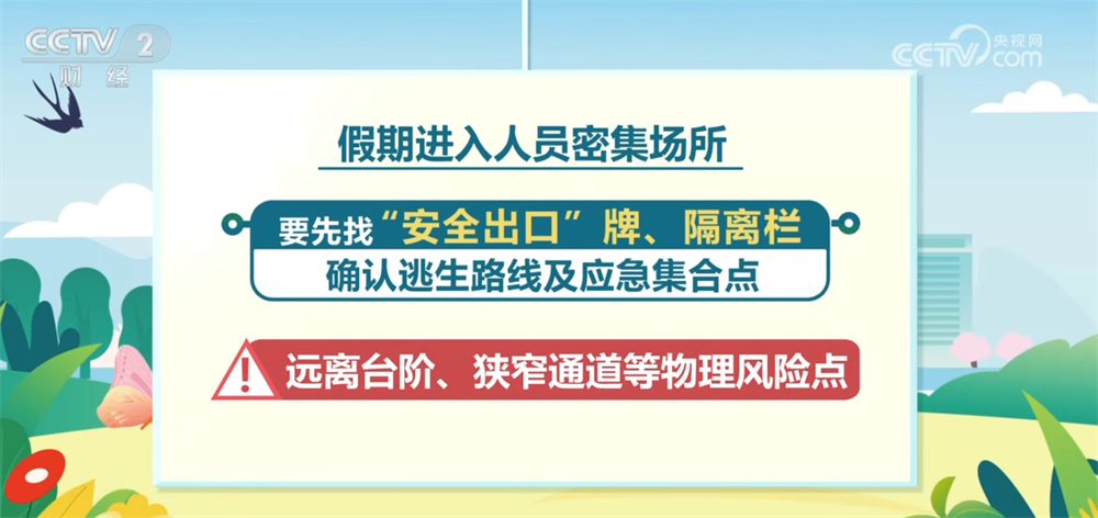 假期进入人员密集场所,要先找“安全出口”牌、隔离栏,确认逃生路线及应急集合点。远离台阶、狭窄通道等物理风险点。身陷人员密集区时,双手交叉护胸撑出呼吸空间,随人流慢移,严禁逆行、停步、弯腰捡物。一旦发现异味、异响或听到广播叫停,严格服从工作人员指令,贴墙快速撤离。