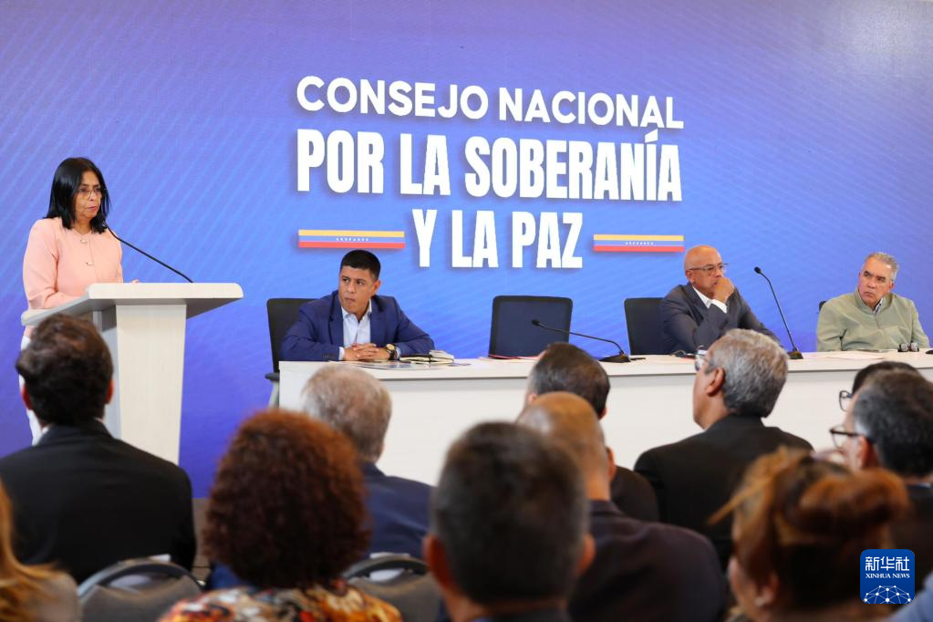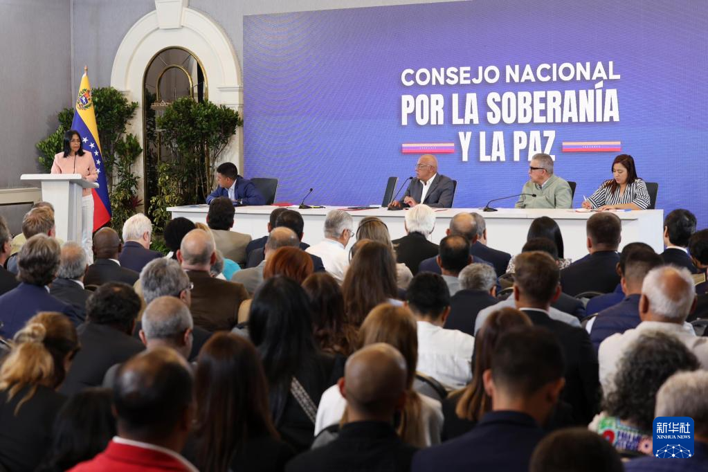 9月29日,委内瑞拉副总统罗德里格斯(左一)在首都加拉加斯召开的驻委外交使团会议上讲话。委副总统罗德里格斯29日在驻委外交使团会议上说,面对美国的威胁,总统马杜罗已签署“外部动荡令”。新华社发(委内瑞拉全国代表大会供图)