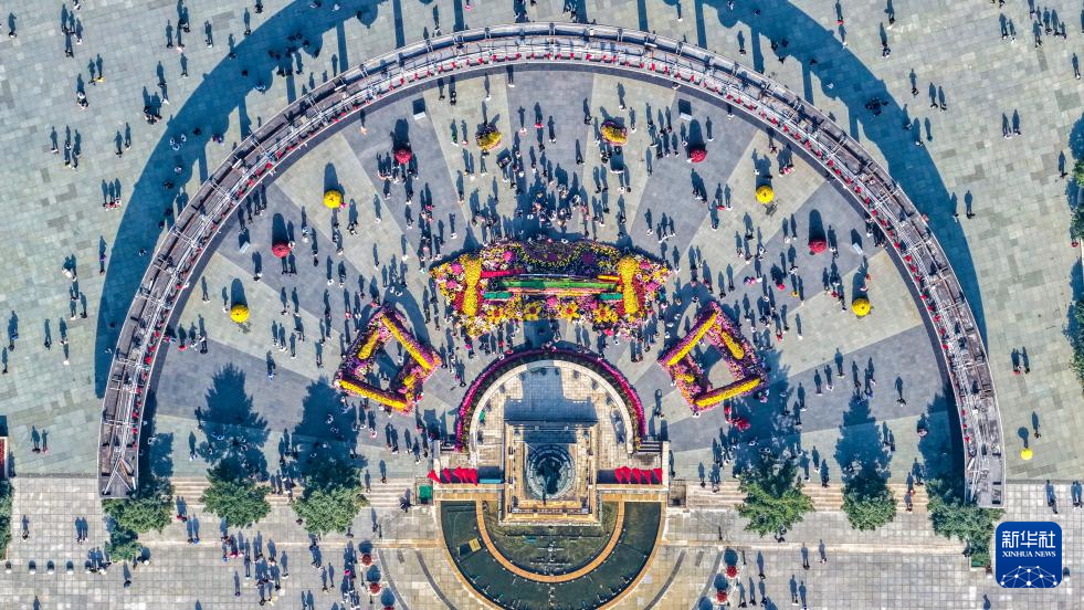 10月2日,游客在黑龙江省哈尔滨市防洪胜利纪念塔广场游玩(无人机照片)。
