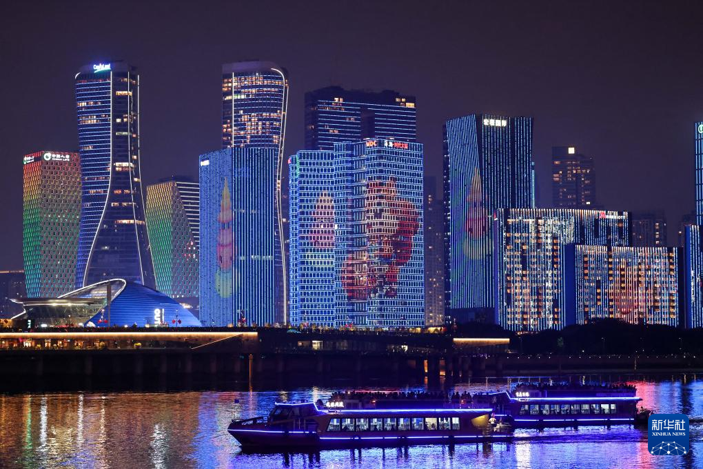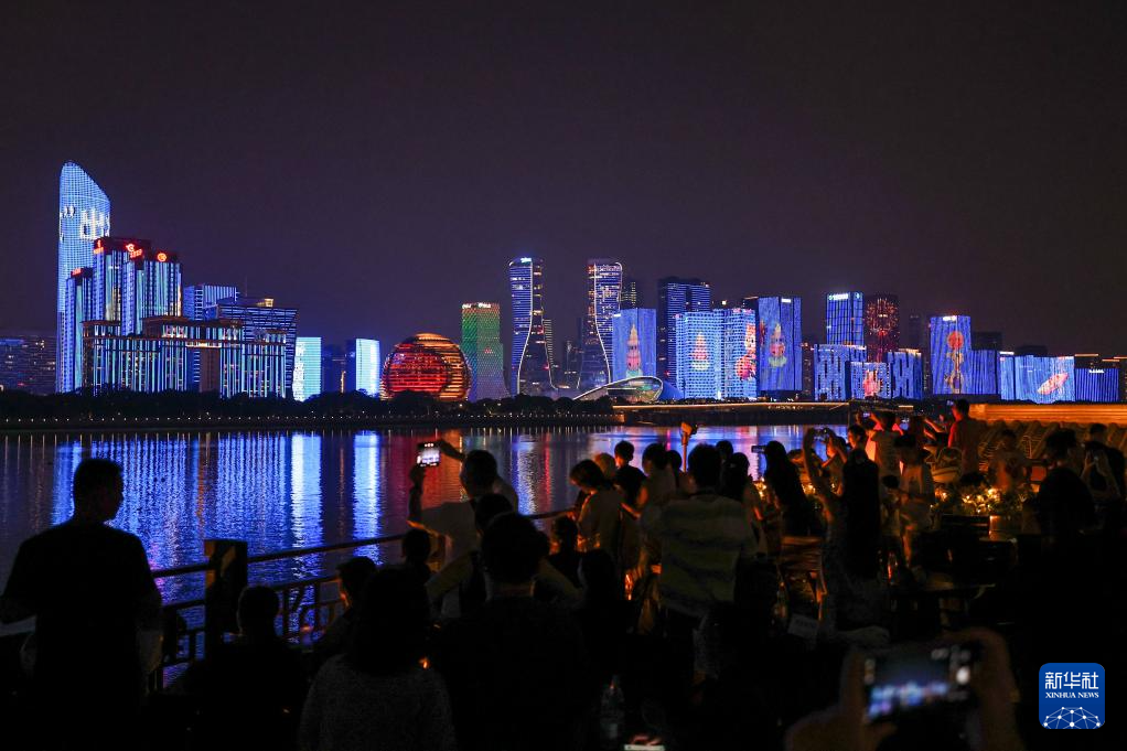 10月2日,游客乘坐游船观赏杭州钱塘江沿岸夜景。