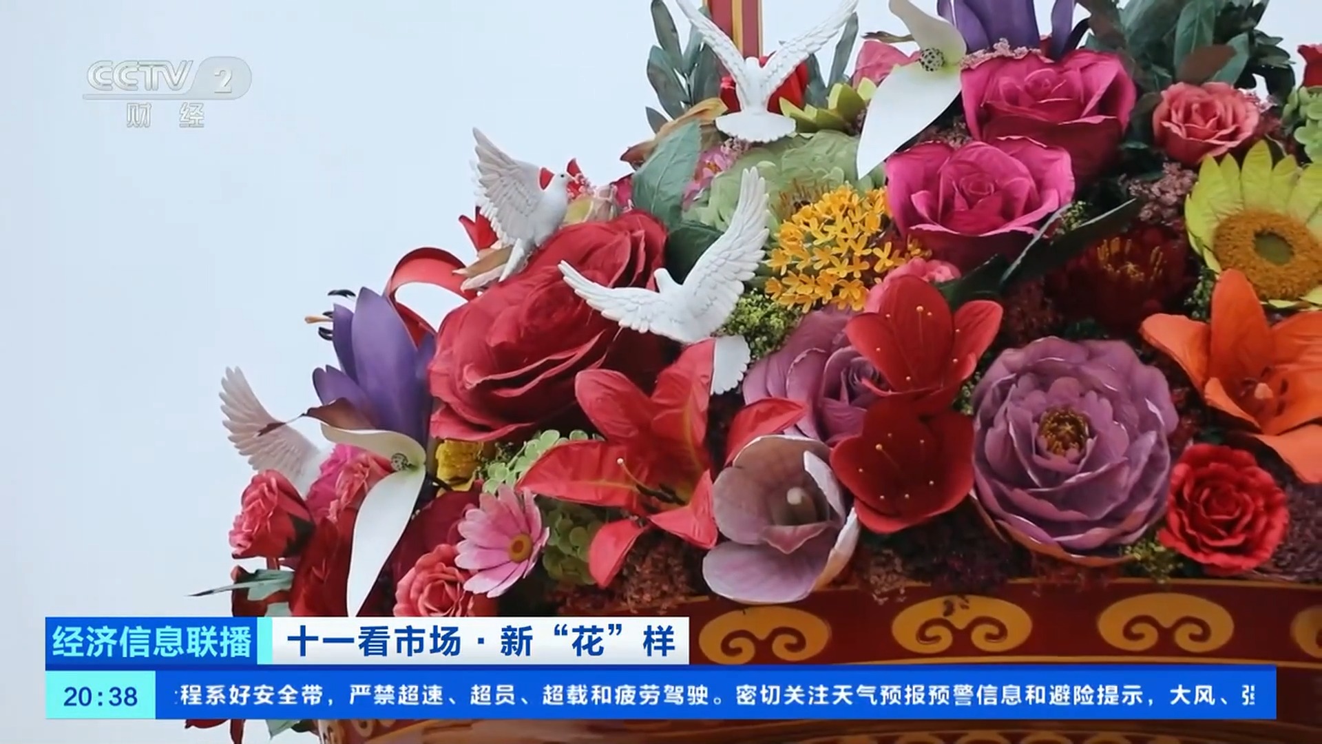 天安门花坛总工程师 张先哲:在天安门广场我们要抗12级风,这些大型的花朵要在大风中岿然不动,依然要保持它良好的面貌,所以我们用的大型仿真花比较多。今年,这些花朵的大小和色彩做得更加精致自如,比如鸢尾花花瓣用了彩绘,让它的细节、纹理、颜色更加逼真。大花篮里的山丹丹、鸽子花,用的雕塑工艺,是用一些不锈钢板敲制出来的。