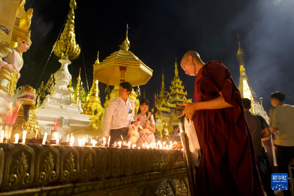 10月6日,一名僧侣在缅甸仰光大金塔点燃蜡烛庆祝点灯节。新华社记者 黎广滔 摄