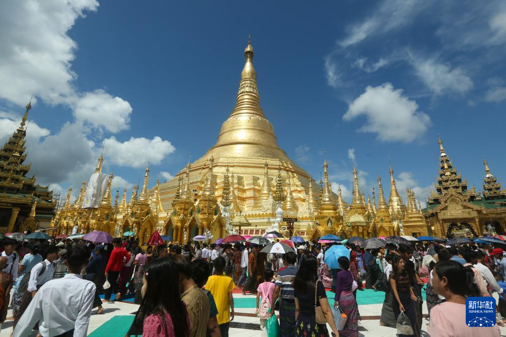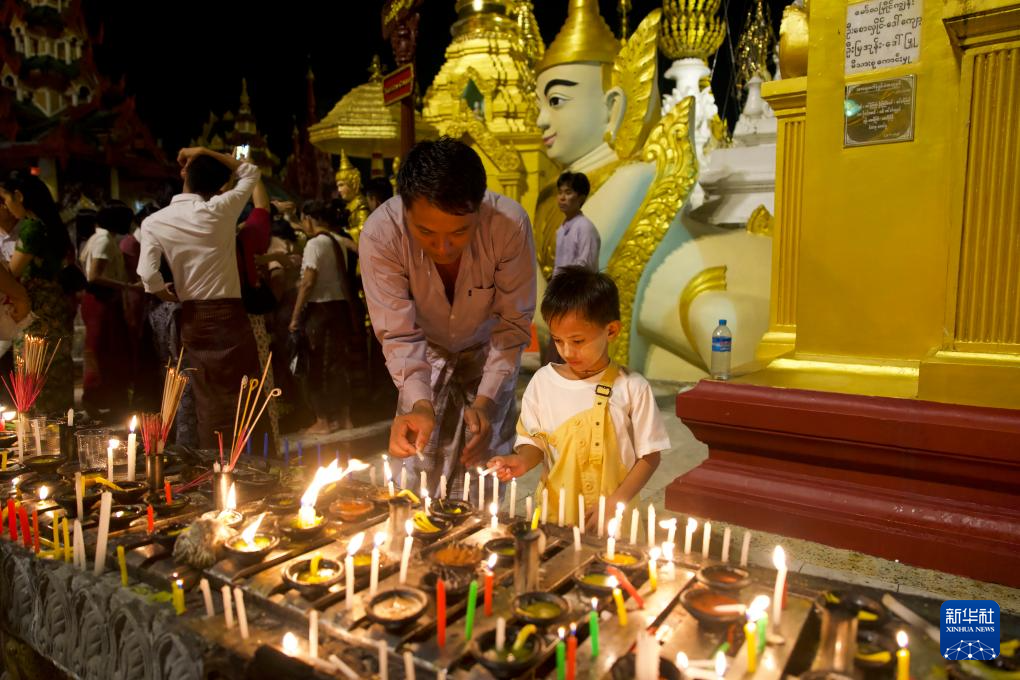 10月6日,民众在缅甸仰光大金塔庆祝点灯节。新华社发(苗觉梭摄)