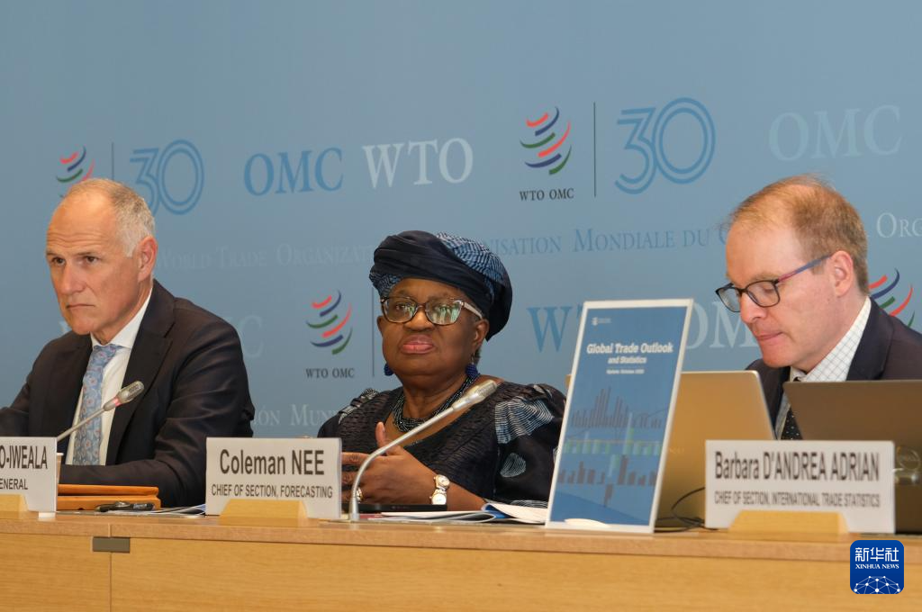 10月7日,在瑞士日内瓦世界贸易组织总部,世贸组织总干事伊维拉(中)在新闻发布会上讲话。