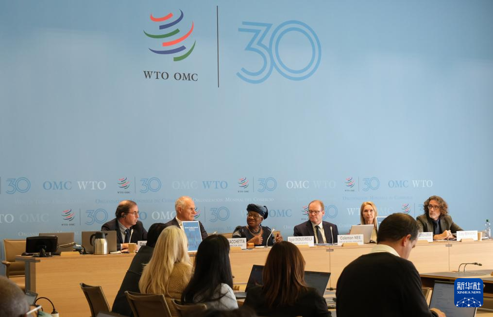 10月7日,在瑞士日内瓦世界贸易组织总部,世贸组织总干事伊维拉(后左三)在新闻发布会上讲话。