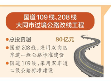 据了解,该过境公路改线工程总投资超80亿元,起点位于现有208线晋蒙交界处(大同市新荣区得胜堡村),终点止于朔州市怀仁市王家堡村。其中,国道208线为项目主线,路线全长104.2千米,采用双向四车道一级公路标准建设,途经大同、朔州两市。国道109线由三条连接线组成,为大同市新荣区段支线、云州区段支线、大同国际陆港连接线,全长28.2千米,均采用双车道二级公路标准建设,设计速度80公里/小时。