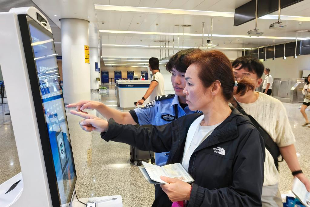 10月1日,在重庆江北国际机场,重庆出入境边防检查总站民警帮助韩国旅客填写入境信息。新华社发(曾言延 摄)