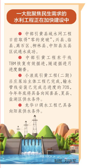 本报讯(记者高桦)10月9日,记者从万家寨水控集团了解到,由该集团负责建设的中部引黄县域水网工程日前取得“零的突破”,兴县、临县、离石区、柳林县、中阳县五县区试通水成功。同时,中部引黄工程东干线TBM恢复有效掘进,隧道掘进月进度翻番。小浪底引黄工程(二期)吕庄泵站主体工程已完成,输水管线安装已完成总进度的70%,今年年底将具备向闻喜县、夏县、盐湖区供水条件。龙华口调水工程已具备向阳泉供水条件……该集团负责建设的一大批聚焦民生需求的水利工程正在加快建设中。