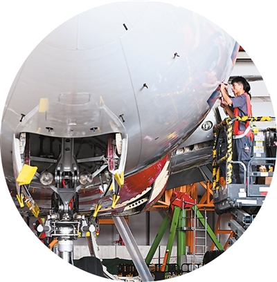 工作人员在海南自贸港一站式飞机维修产业基地检修飞机。新华社记者 杨冠宇摄
