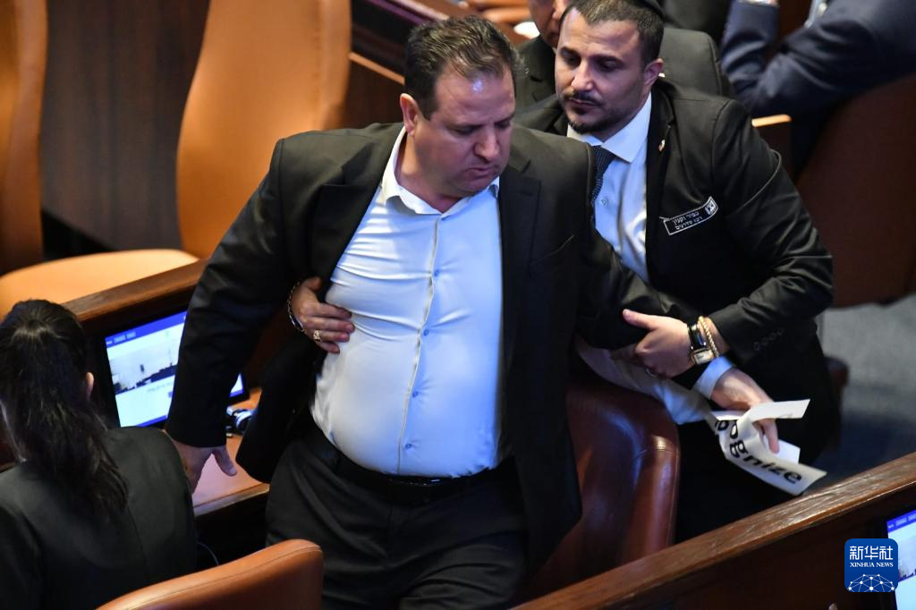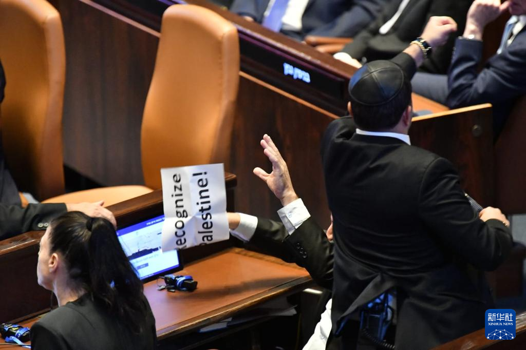 报道说,两人因此被“请出”议会。其中一人手持的标语牌上写着“承认巴勒斯坦国”。