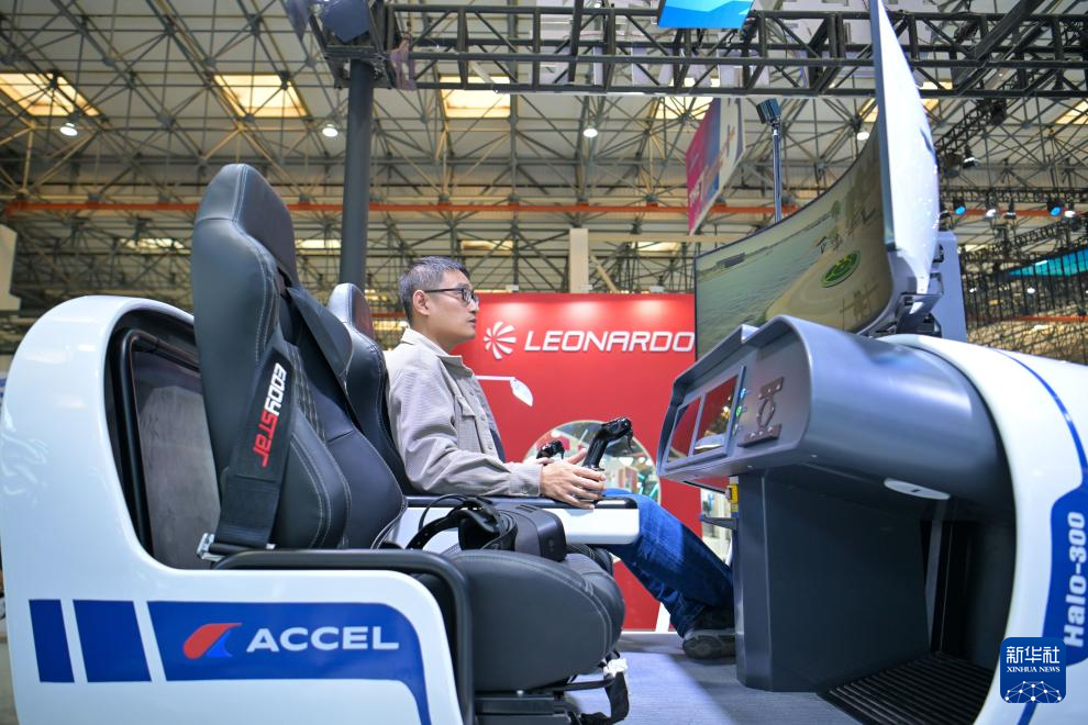 10月14日,工作人员在天津直博会直升机馆内调试模拟飞行体验设备。新华社记者 孙凡越 摄