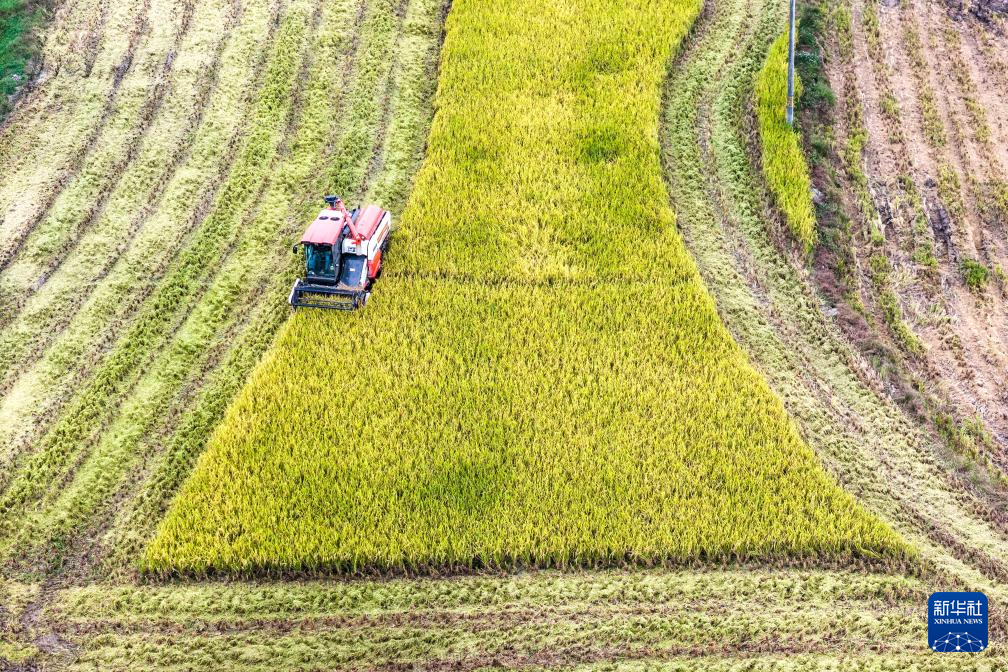 10月15日,在湖南省娄底市双峰县荷叶镇白泥村,农民驾驶农机收割晚稻(无人机照片)。新华社发(李建新 摄)
