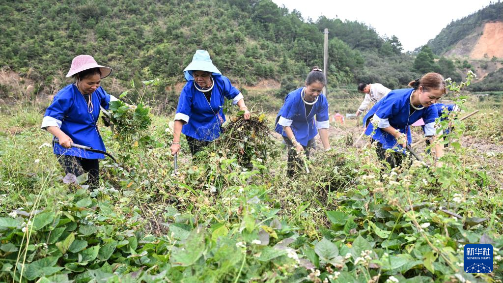 10月15日,广西三江侗族自治县林溪镇高秀村村民在割薯藤采收红薯。新华社记者 张爱林 摄