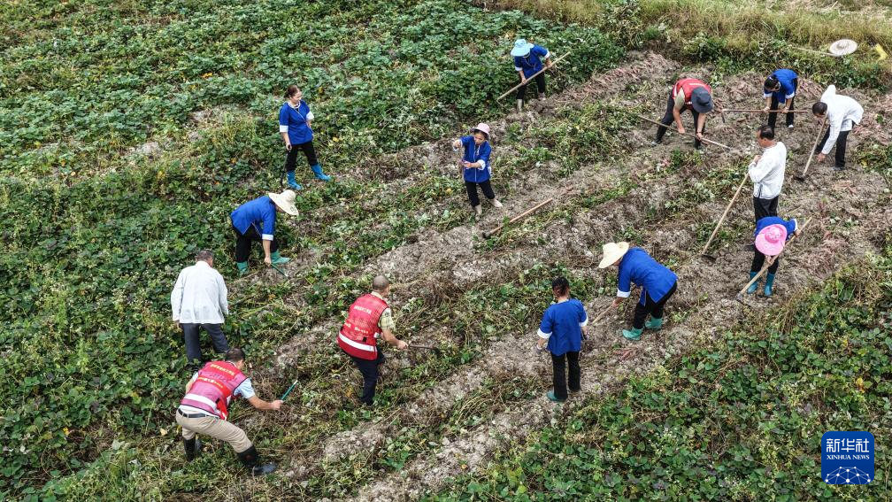 10月15日,广西三江侗族自治县林溪镇高秀村村民在田间收获红薯(无人机照片)。新华社记者 张爱林 摄