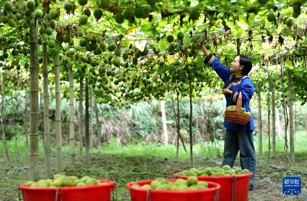 10月14日,村民在贵州省黔东南苗族侗族自治州榕江县忠诚镇俾堵村罗汉果种植基地采摘罗汉果。新华社发(李长华 摄)