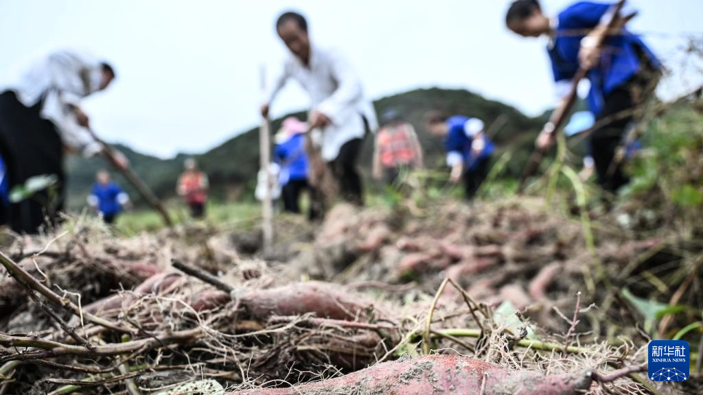 10月15日,广西三江侗族自治县林溪镇高秀村村民在田间收获红薯。