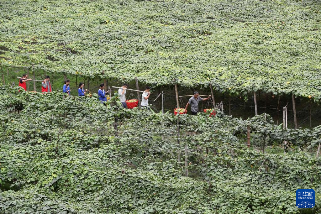 10月14日,村民在贵州省黔东南苗族侗族自治州榕江县忠诚镇俾堵村罗汉果种植基地挑运罗汉果。新华社发(李长华 摄)